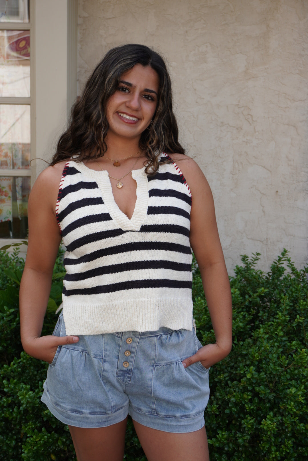 Stars, stripes, and standout style — the America Top is your go-to for patriotic charm with a playful twist. This sleeveless knit features bold navy and white horizontal stripes with a flattering v-cut neckline and raw edge detailing for that effortlessly undone look. The pop of red trim on the armholes adds just the right amount of Americana flair. Pair it with your favorite denim shorts for a cute and casual 4th of July fit or any sunny day out.