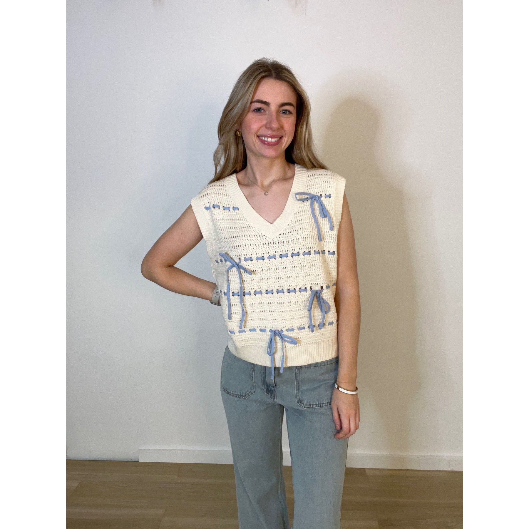 Add a pop of playful charm with our Baby Blue Bow Top! This sweater vest, adorned with a blue ribbon bow, is a must-have.