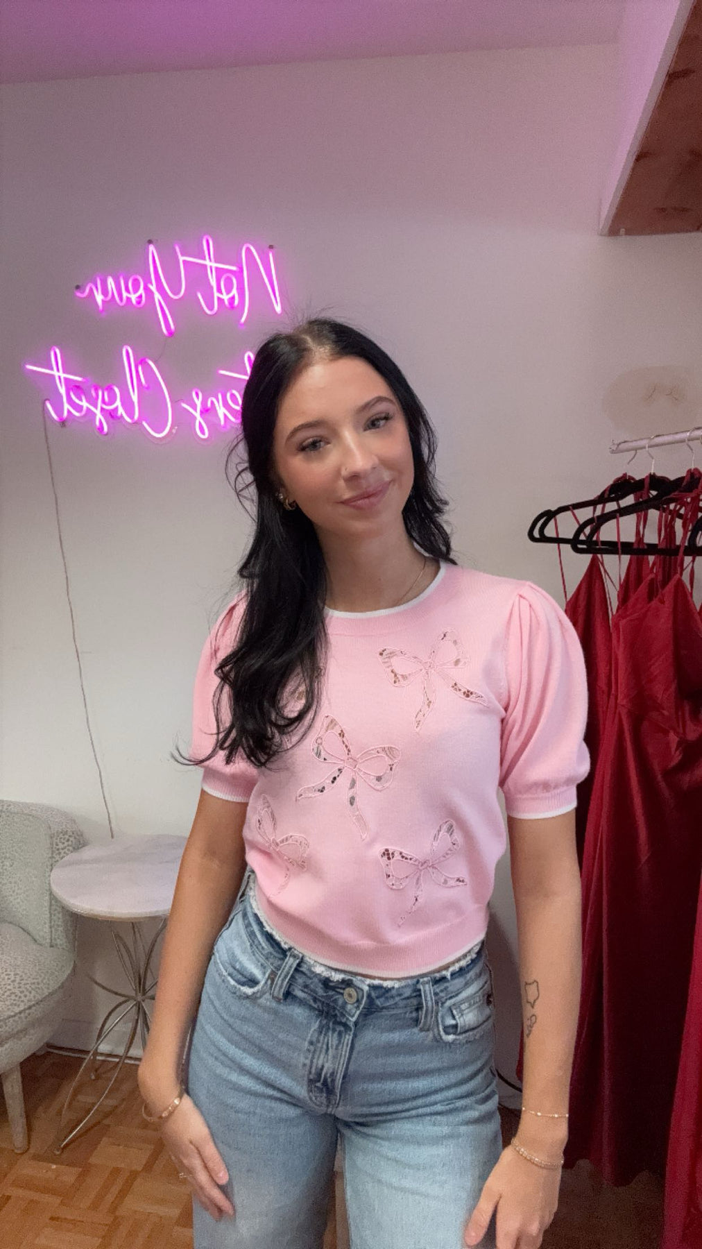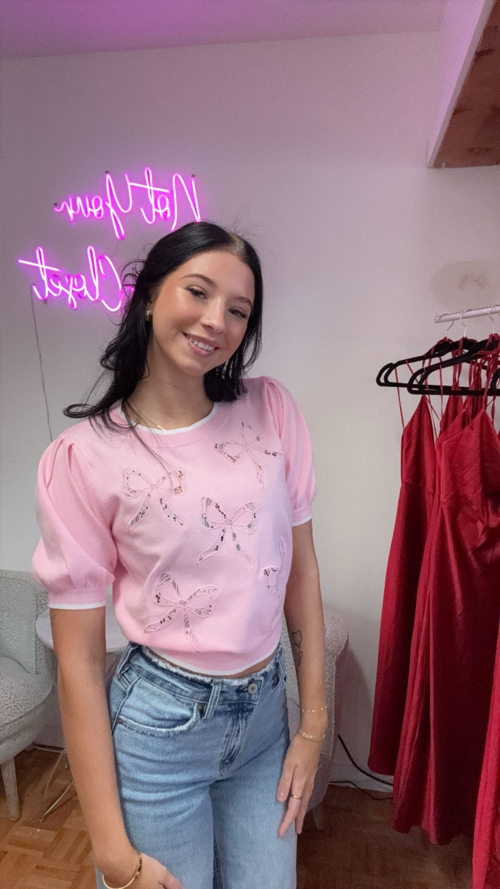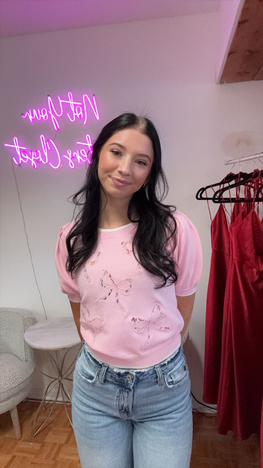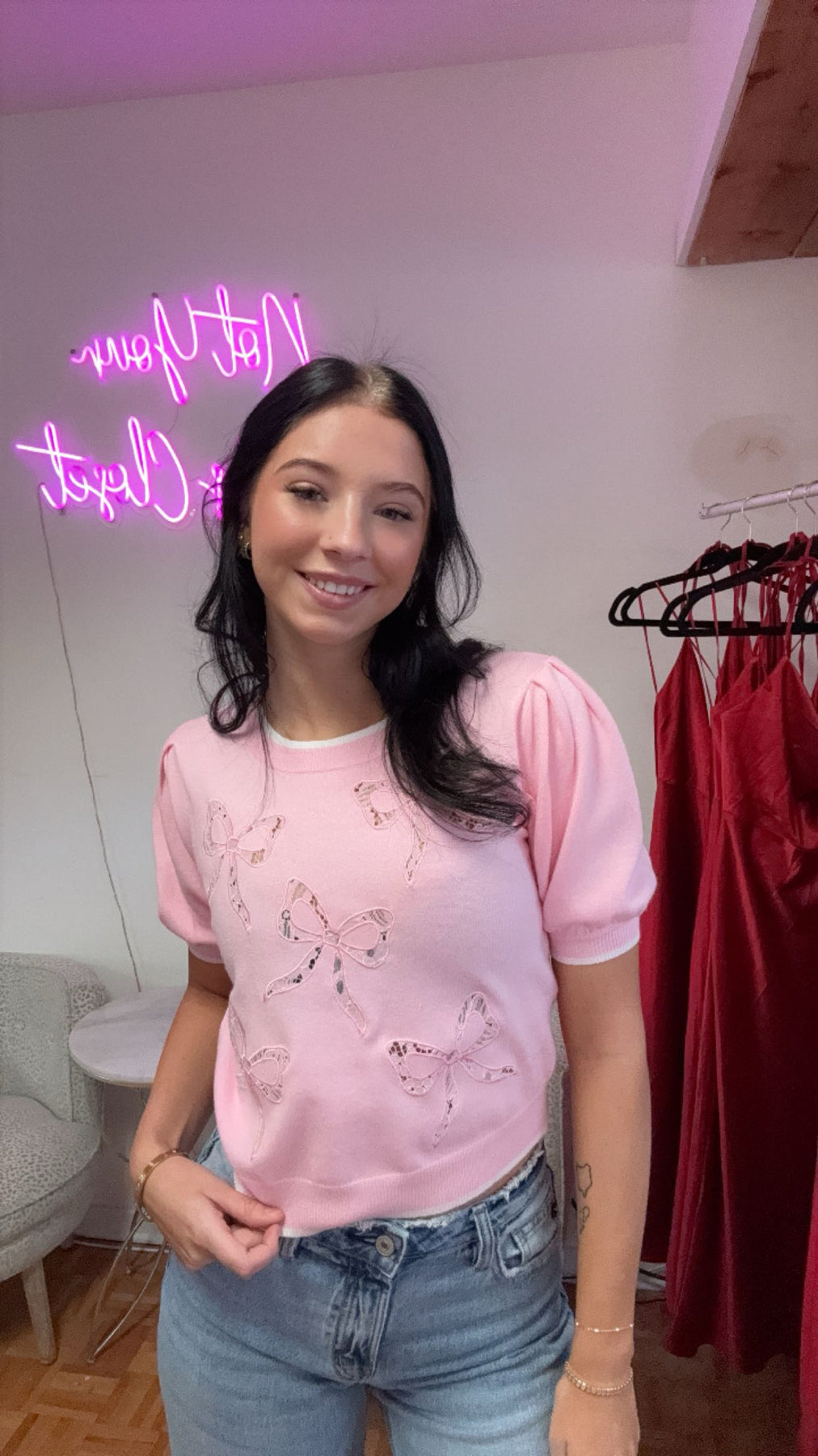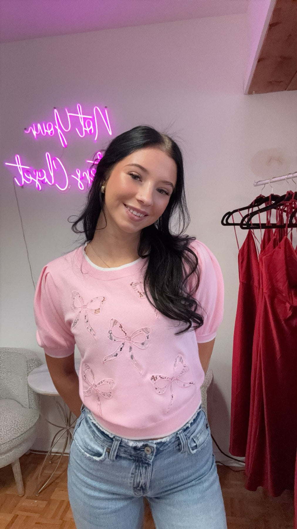 This Close To You Top features a delicate lace pink bows on a cozy sweater material. Perfect for adding a feminine touch to your wardrobe while staying warm and stylish.