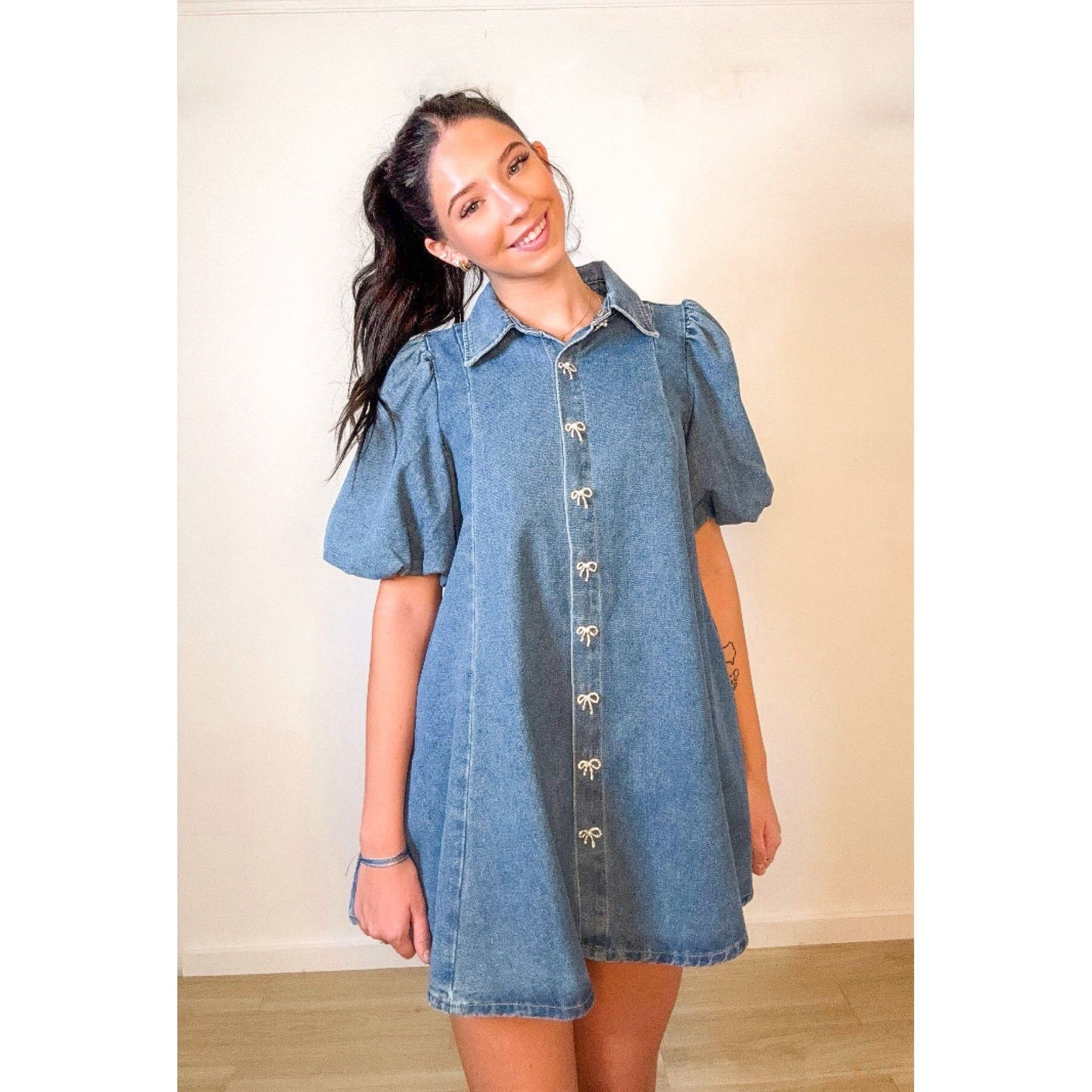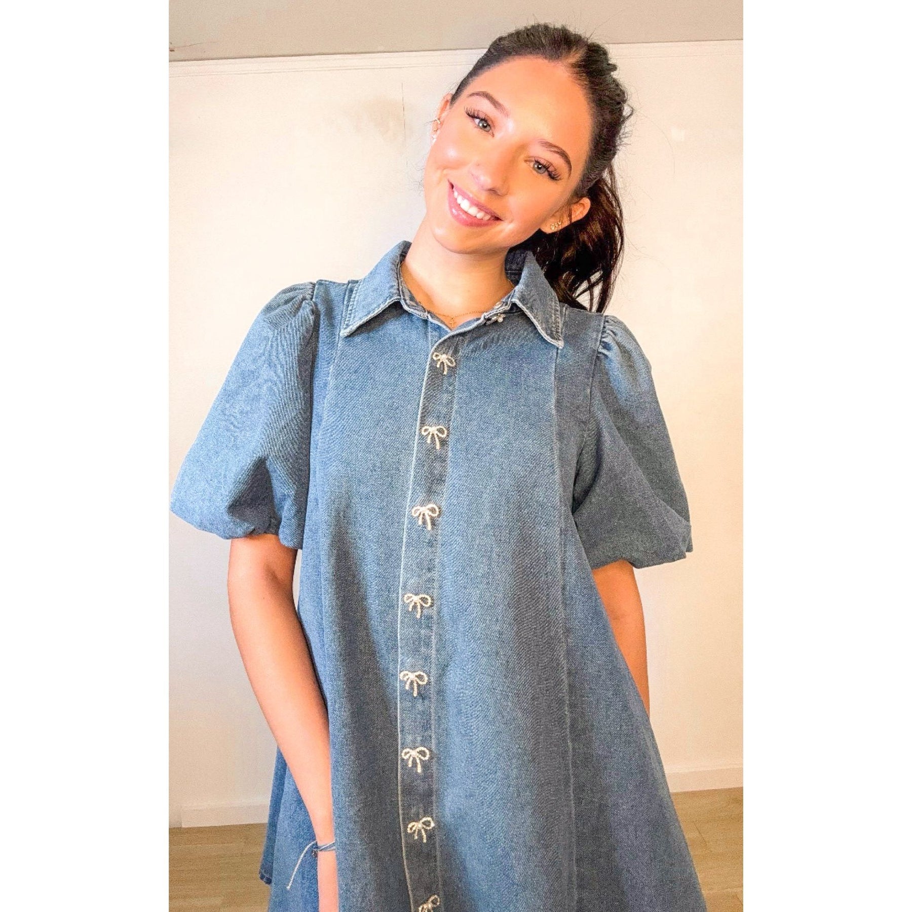 This denim dress is the perfect mix of classic and glam, featuring pearl and jewel bows as well as pockets.