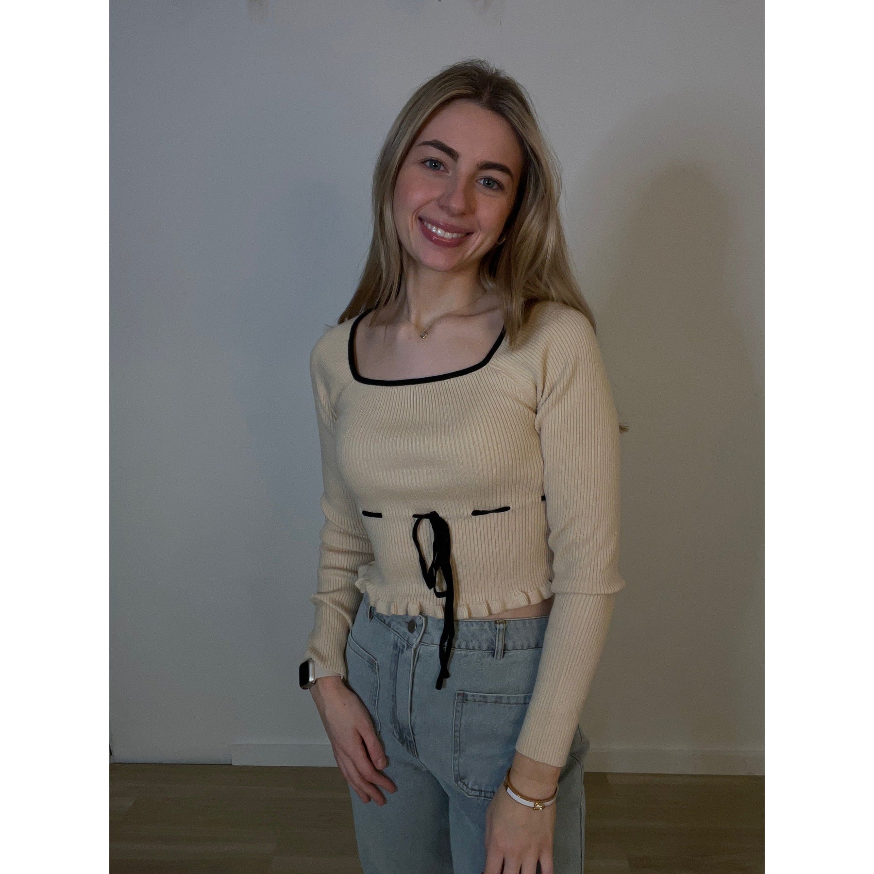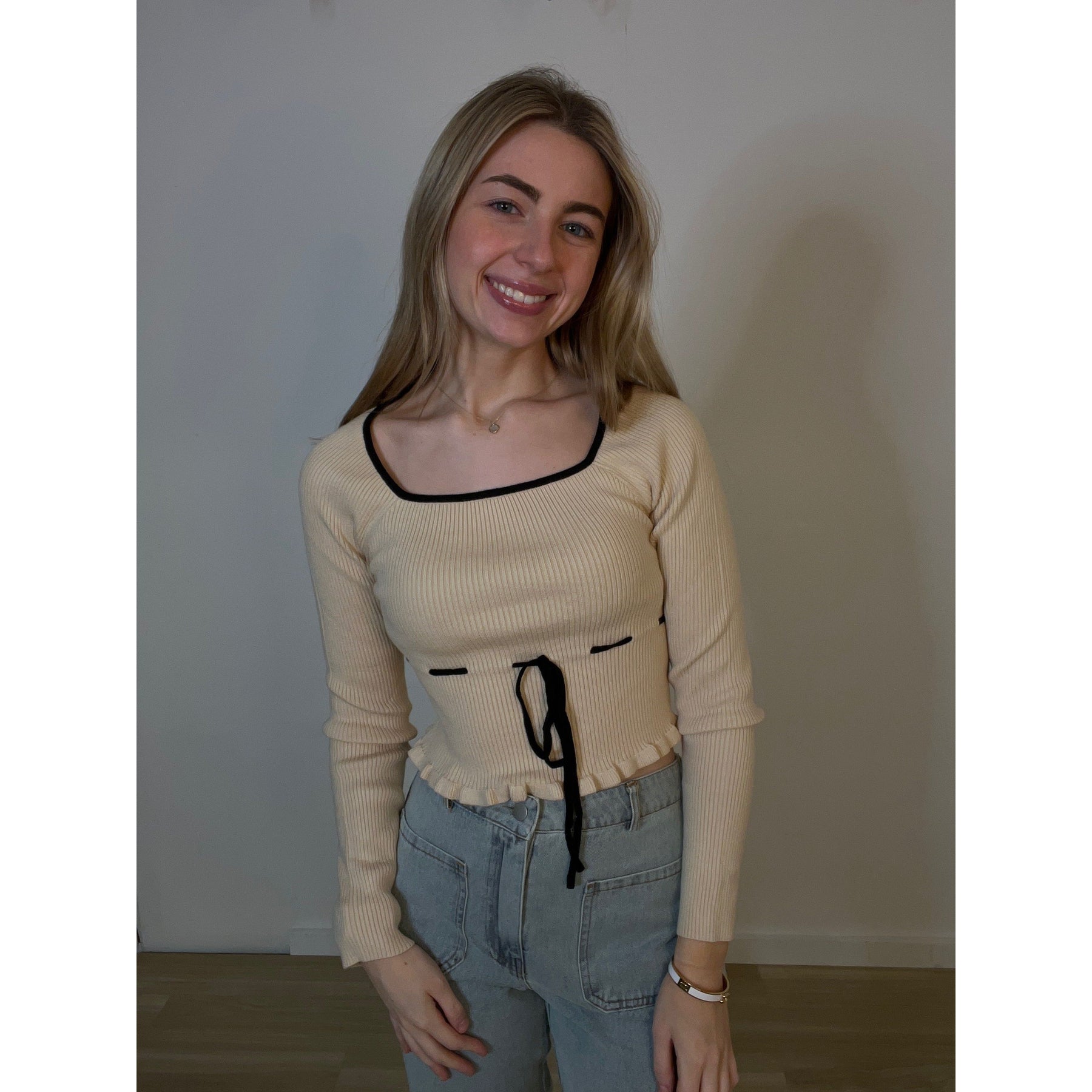 Elevate your style game with our Detail Long Sleeve. This knit top features a charming black ribbon bow and intricate trim detail on the bottom, adding a touch of elegance to your outfit. So go on, tie up this trendy piece and elevate your look!