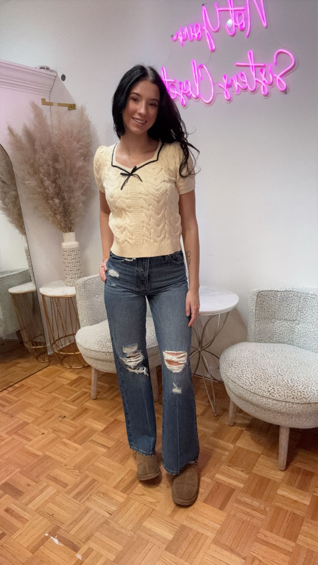 The Devon Top is a cream short sleeve knit top, featuring a sophisticated black bow on the front neckline. Elevate your style with this elegant and versatile piece, perfect for any occasion!