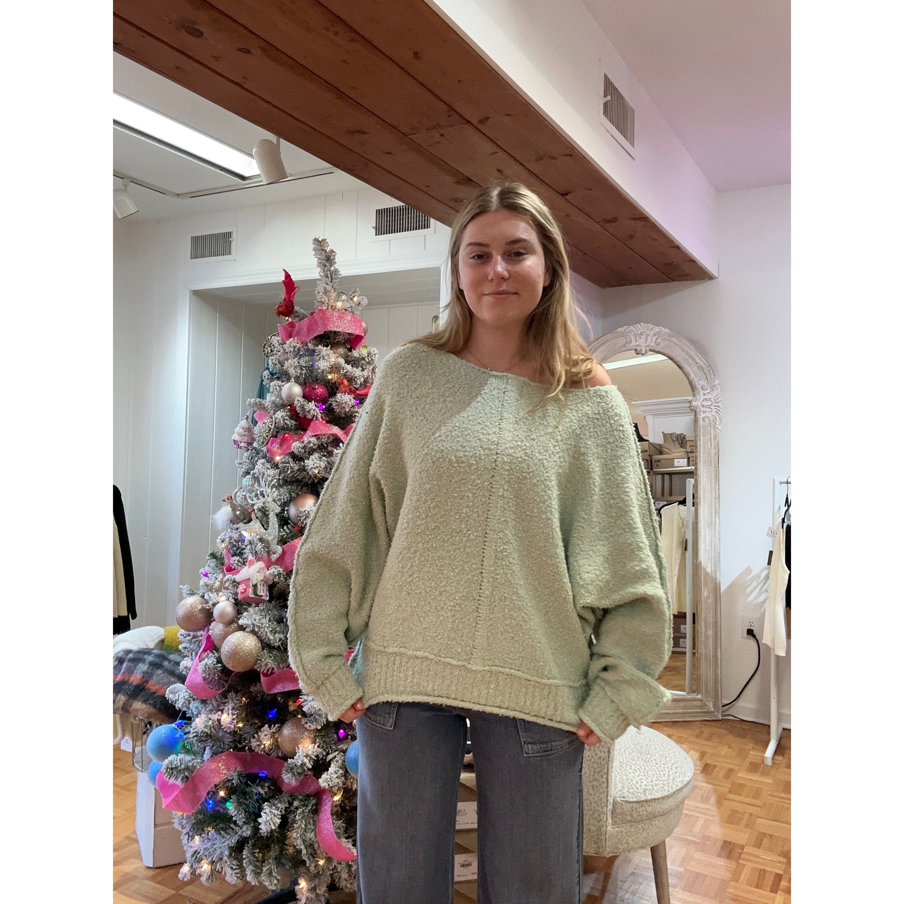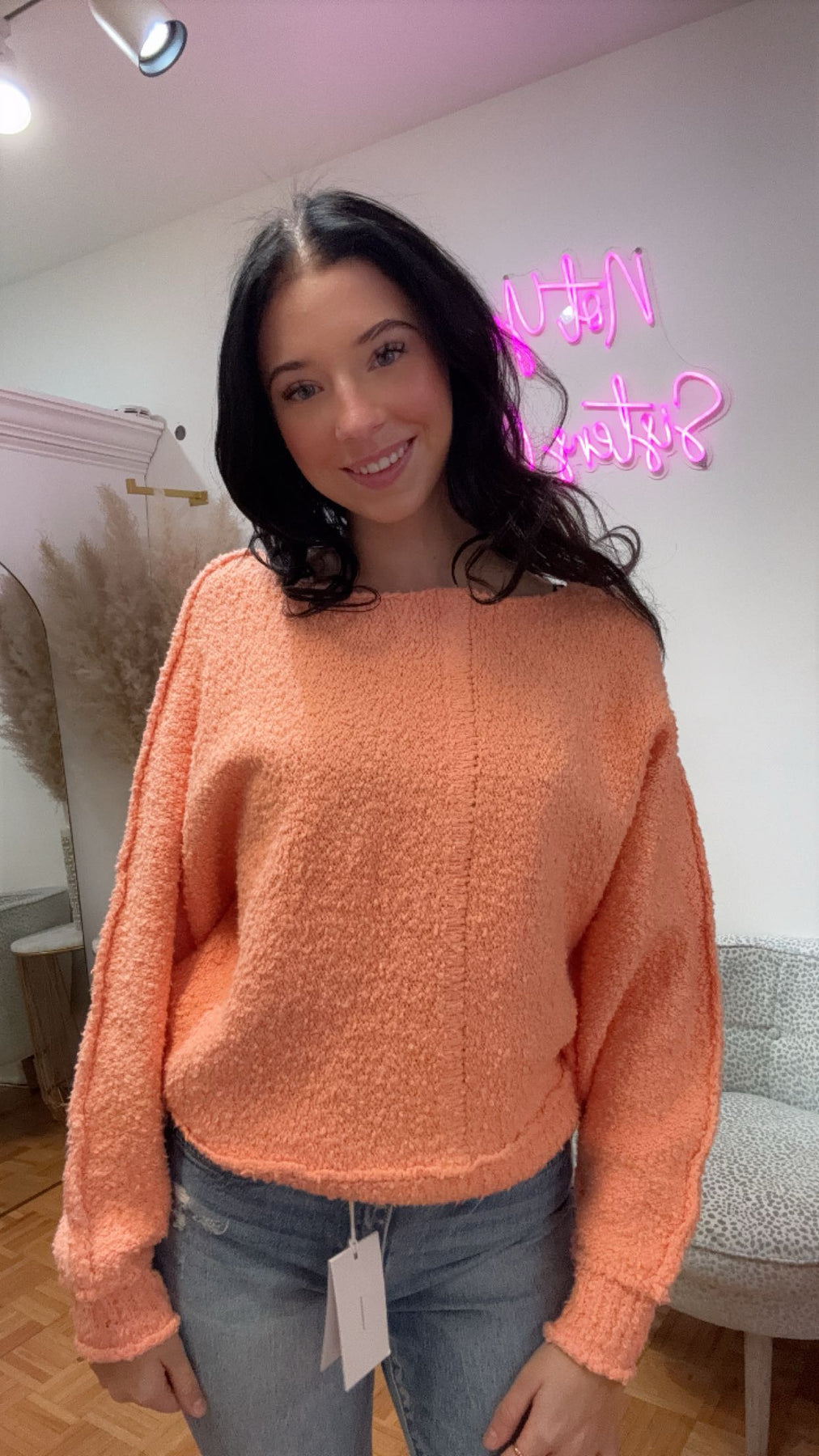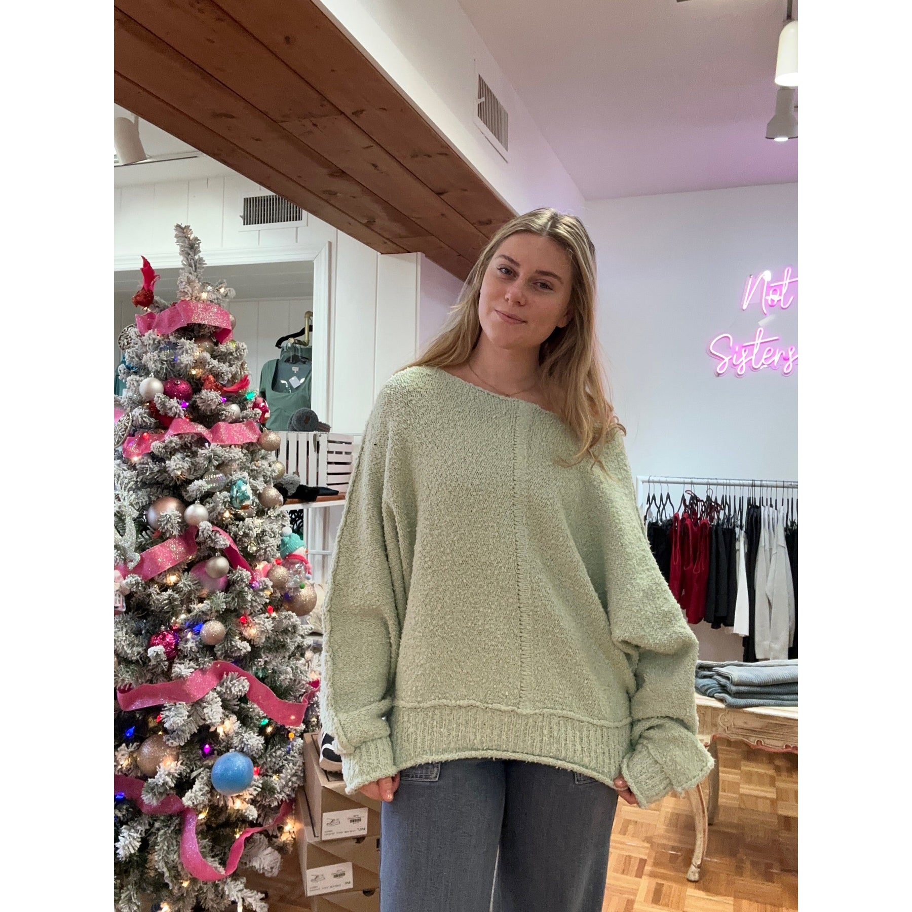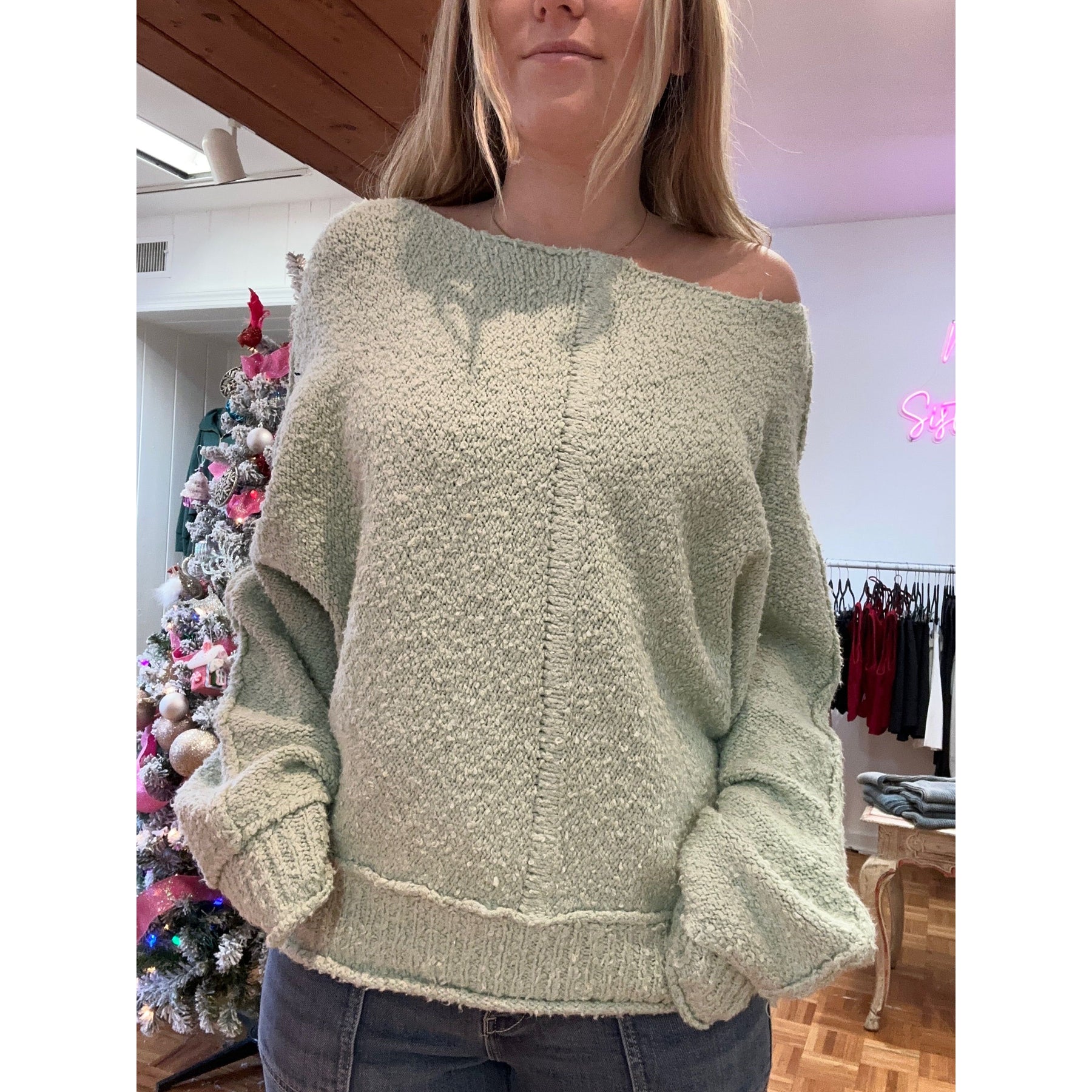 Stay cozy in the Dusty Sweater, available in mint green or coral! This fuzzy sweater will keep you warm with its soft fabric and stylish colors, perfect for spring!