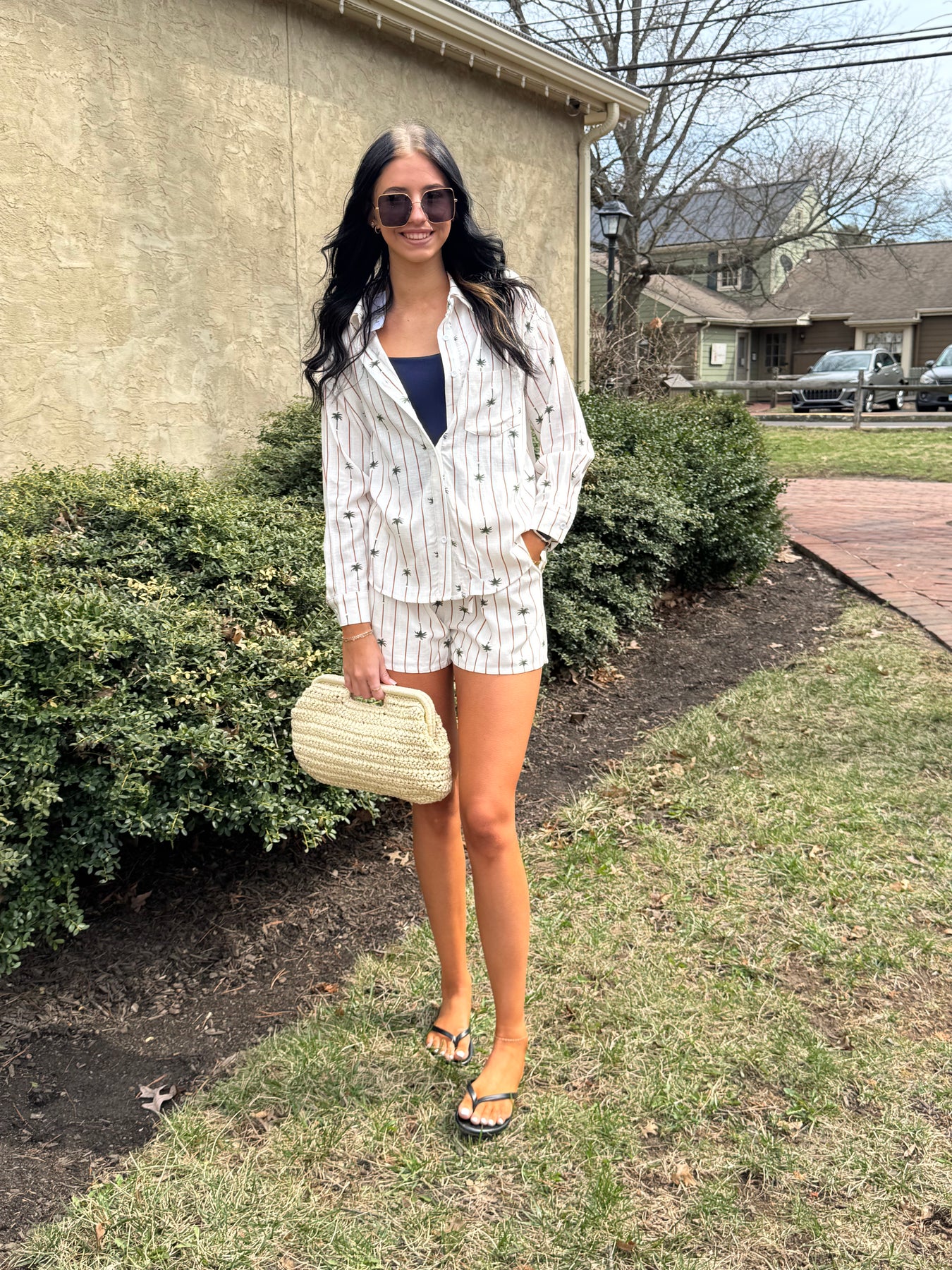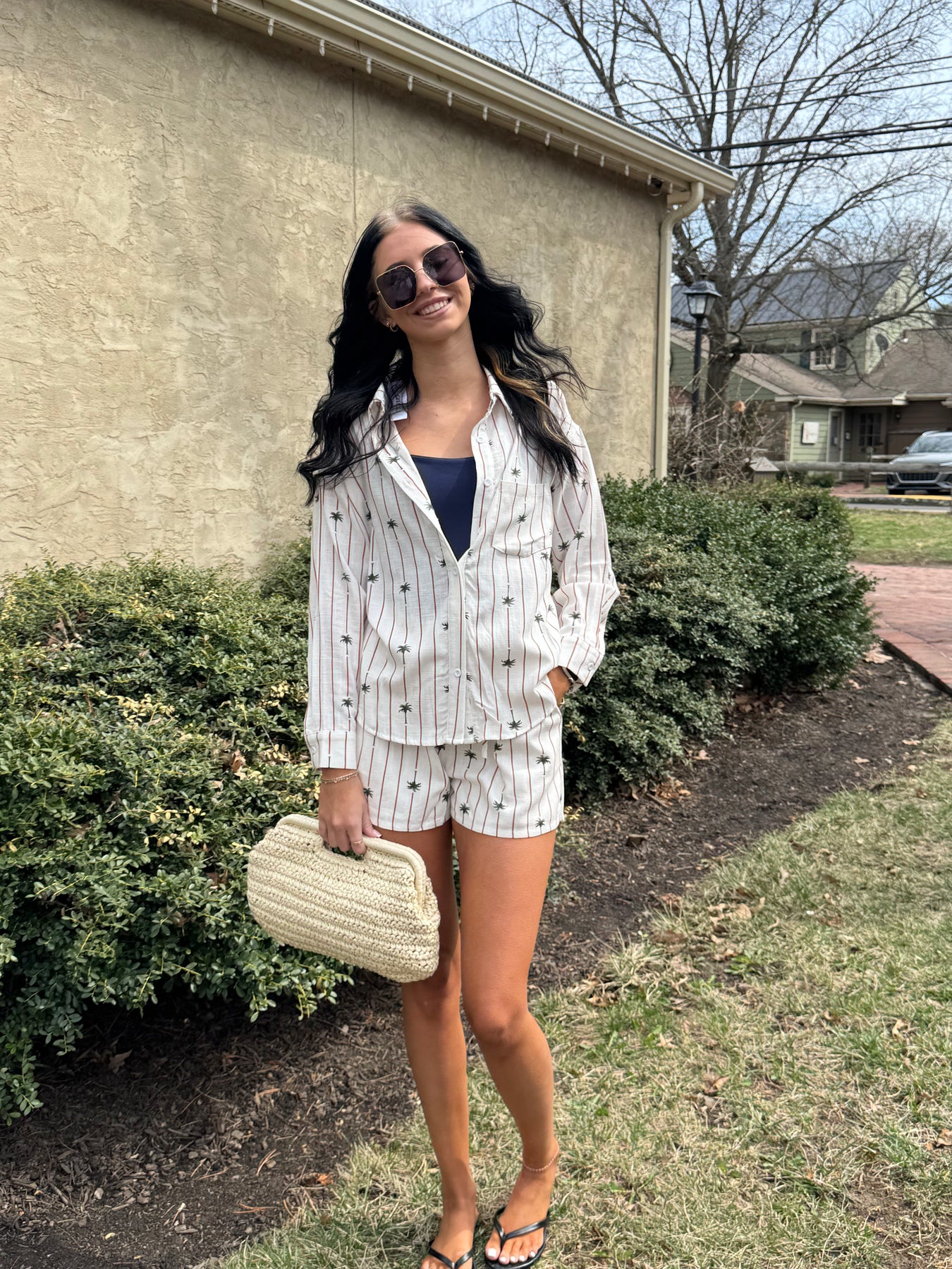 Embrace laid-back luxury with this lightweight linen shirt set, featuring earthy brown stripes and vibrant green palm tree accents. Designed for comfort and style, the breathable fabric keeps you cool even on the hottest tropical days, making it the perfect choice for beach getaways, poolside lounging, or casual island adventures. The relaxed fit and natural texture give it an effortless vibe, while the unique print adds a touch of personality. Pair it with sandals and sunnies, and you're vacation-ready.