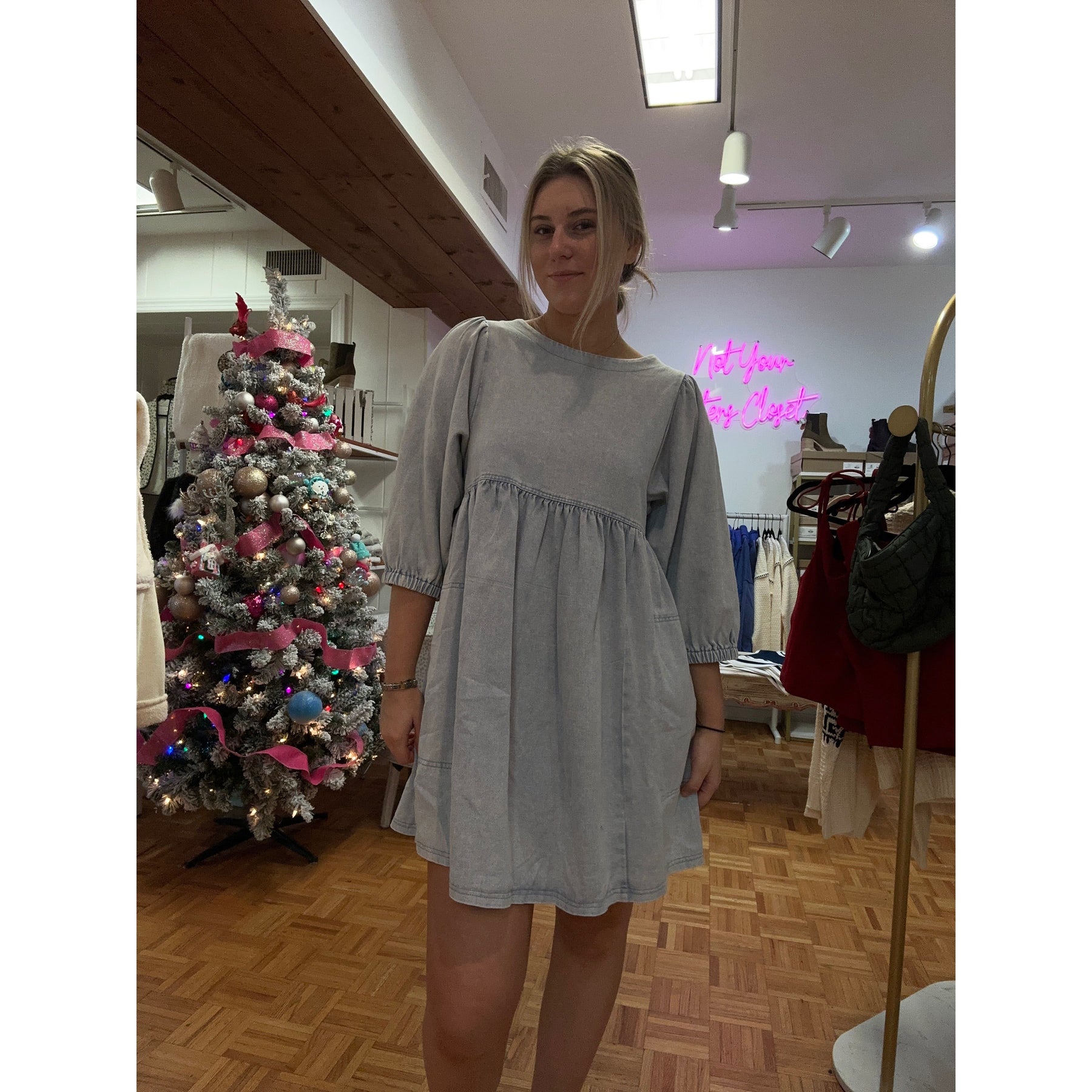 Our denim style baby doll dress, designed with sleeves and pockets, it offers both style and functionality. Crafted with comfort in mind, this light blue dress is perfect for day-to-day wear.