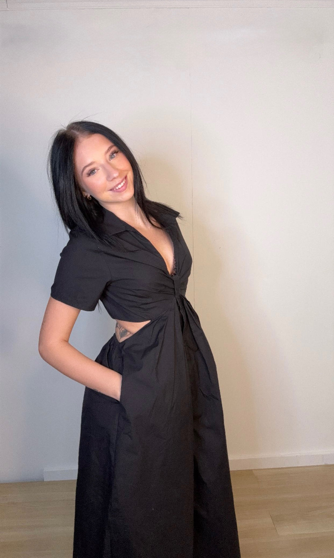 This midnight dress features a collared button down design with black short sleeves, adding a touch of elegance and sophistication. The cut outs provide a playful, yet subtle reveal, making this dress perfect for a night out. The flowy fabric adds comfort and effortless movement!