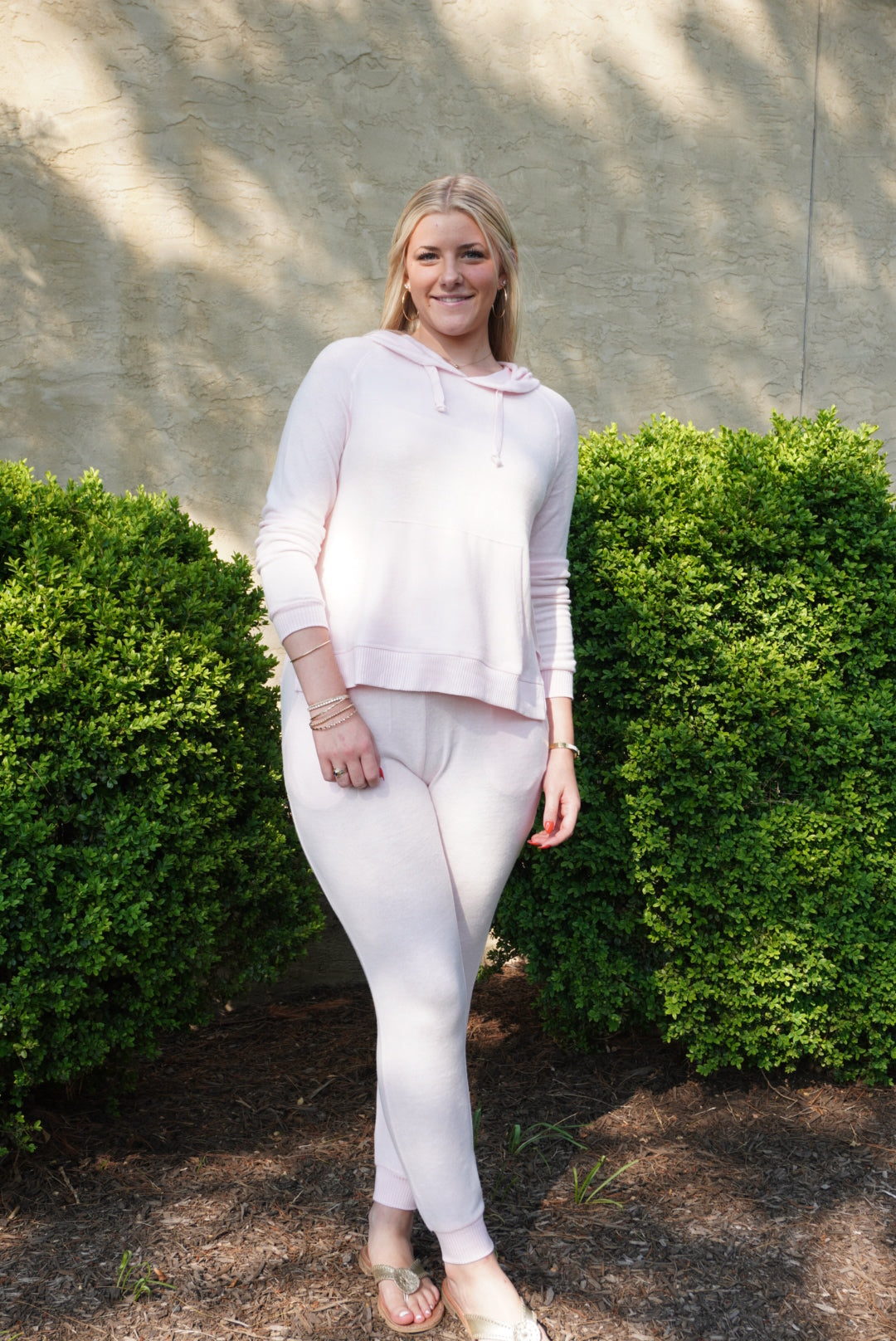 Meet your new favorite cozy essential: the Paradise Hoodie. This ultra-soft hoodie in a dreamy blush pink features a relaxed fit, front kangaroo pocket, and ribbed hem and cuffs for that perfect blend of comfort and polish. Lightweight yet warm, it's the ultimate go-to for lounging at home or layering on the go.