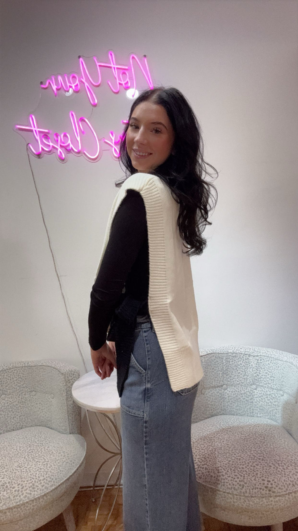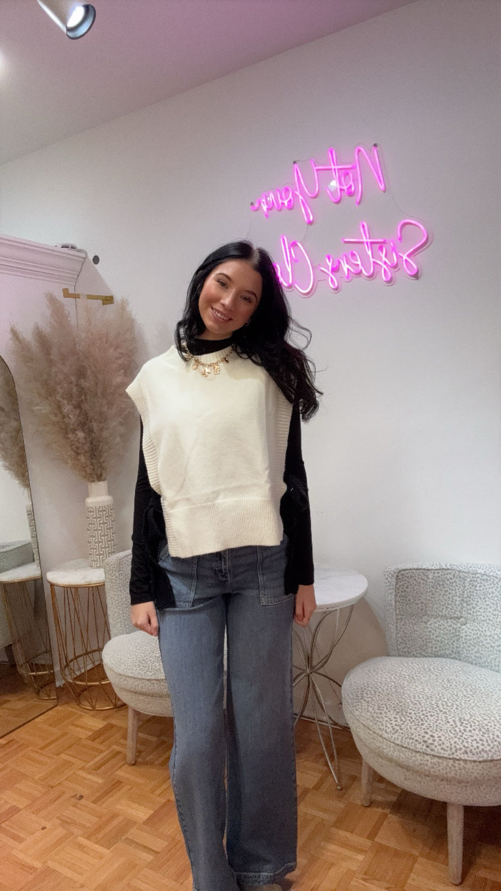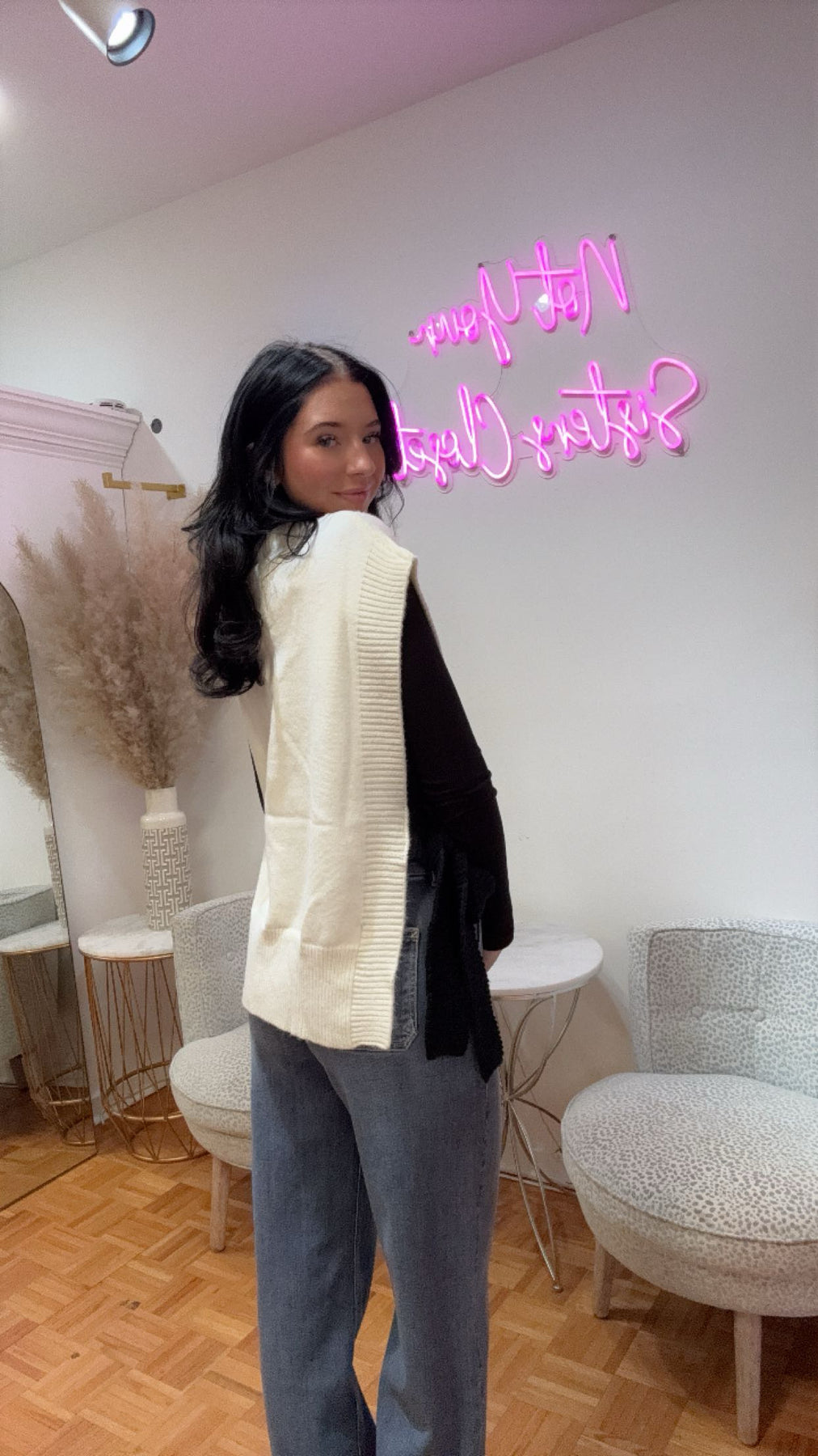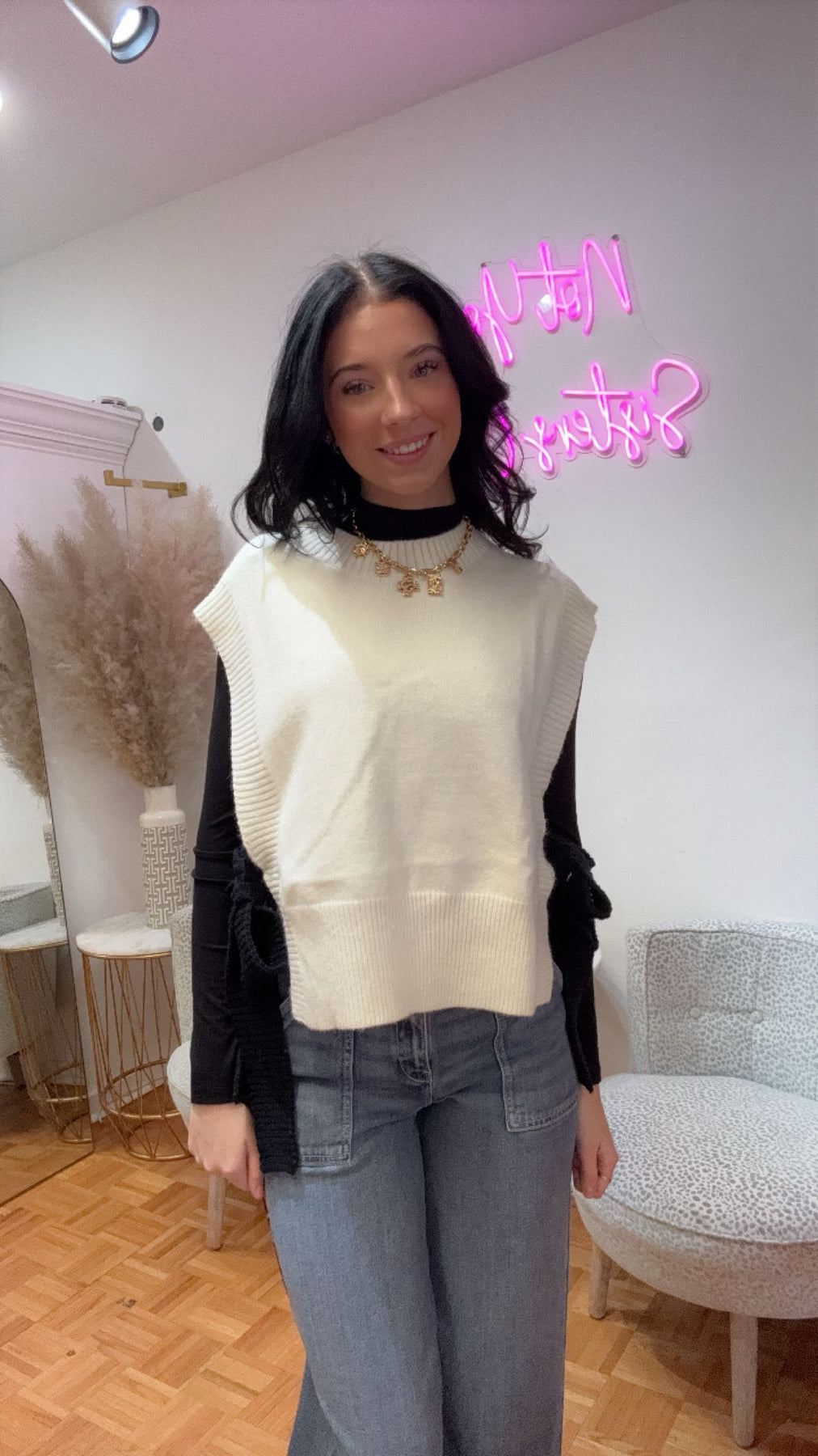This white knit vest with black tie sides is a stylish addition to any wardrobe. Made with high-quality materials, it offers both comfort and sophistication. The unique tie sides add a touch of elegance, making it the ideal choice for any occasion.