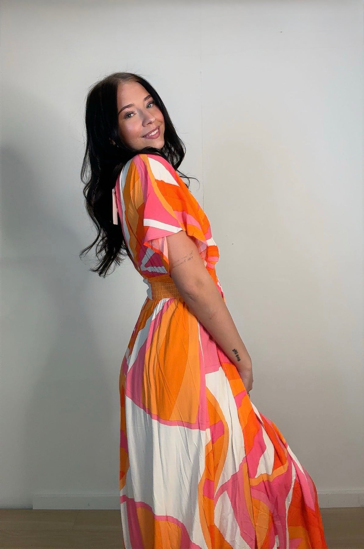Turn heads in the Sunlight Dress, a vibrant showstopper that brings the heat. Featuring a dreamy flowy silhouette, this dress is bathed in bright shades of orange and red—like a summer sunset. The deeply cut V-neck adds just the right amount of allure, complemented by a delicate button-neck closure for a subtle vintage touch. High side slits on both sides create effortless movement and just the right amount of drama. Perfect for golden hour strolls or dancing under the stars.
