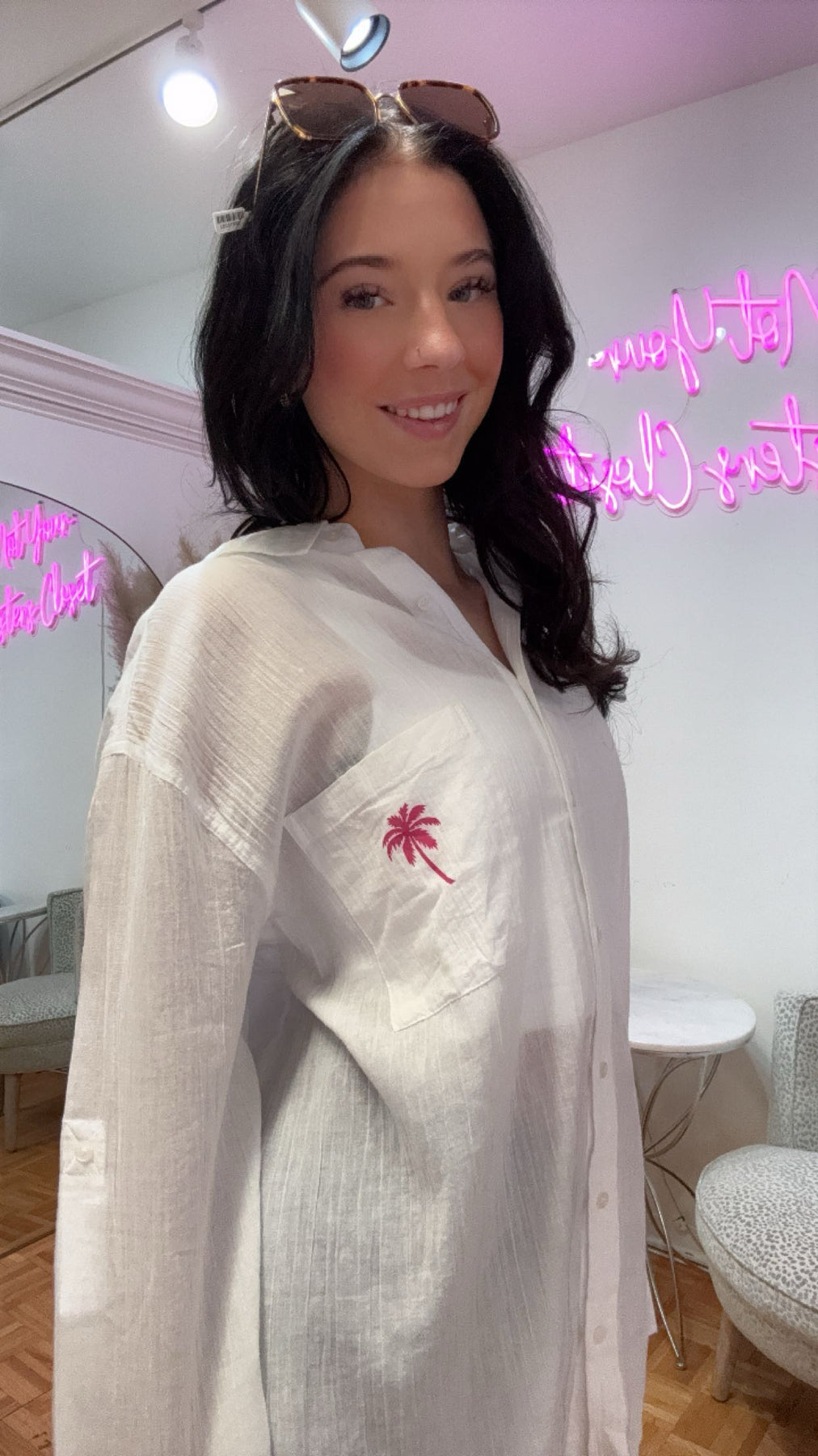Take your beach style to the next level with our Sunshine Top. This long sleeve button up top features a beautiful beach design on the back. Perfect for any beach day, this top will keep you looking and feeling cool.