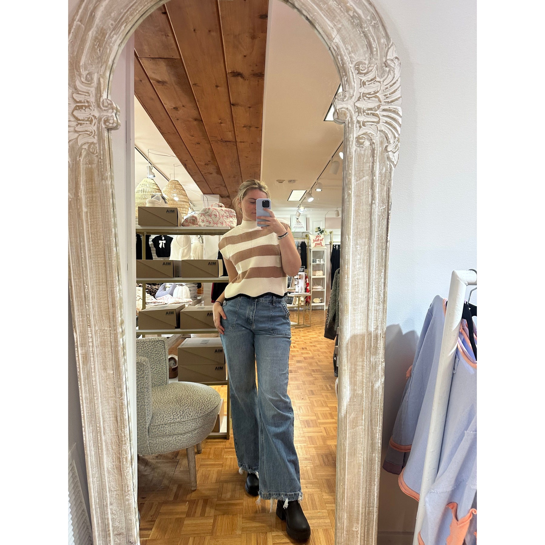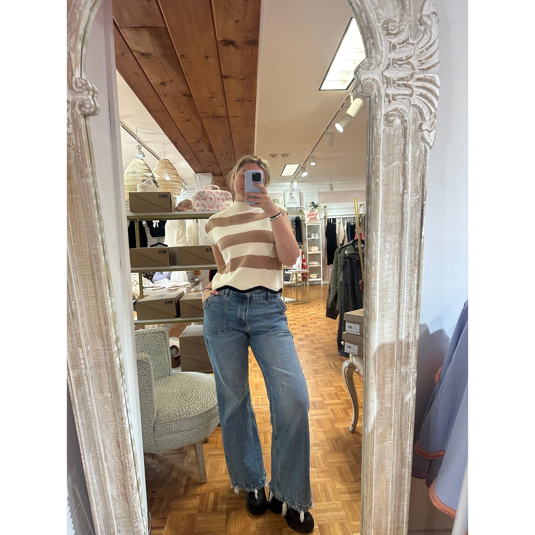 Elevate your wardrobe with our With A Smile Top. Featuring a classic striped design in a warm tan and cream, this short sleeve sweater top offers both style and comfort. Perfect for a relaxed yet put-together look. Features a black trim scalloped detailing at bottom.